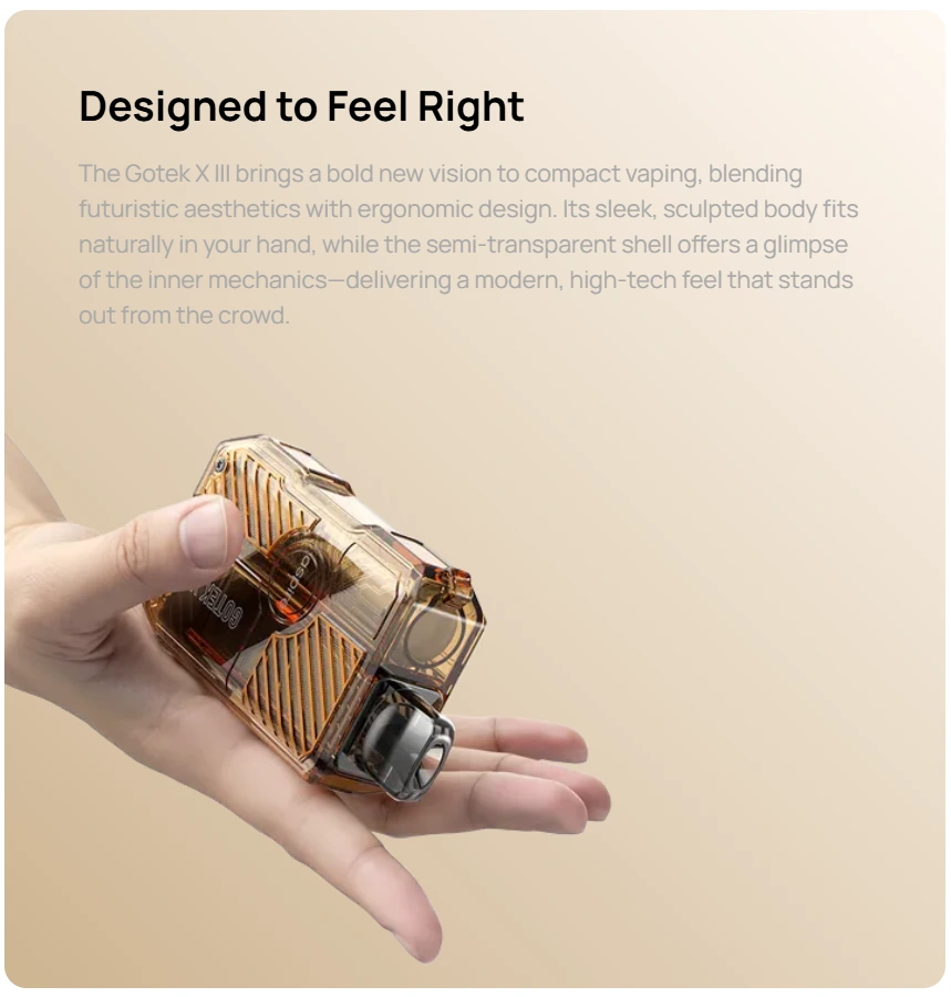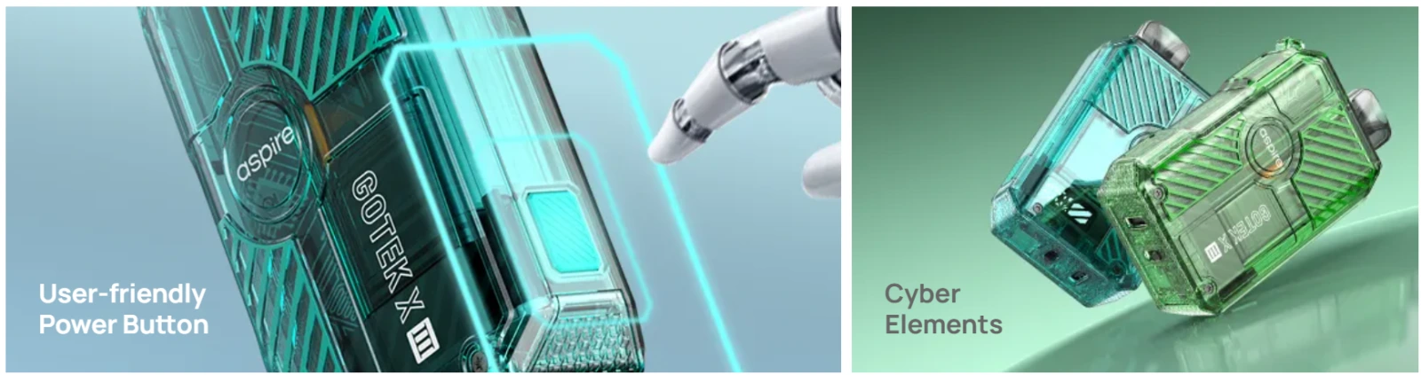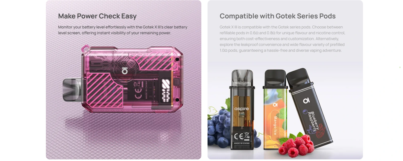 With a 1200mAh battery and fast USB-C charging, the Aspire Gotek X3 is designed for all-day use. The refillable pods feature a side-fill system with a silicone stopper to prevent leaks and make refilling clean and easy.